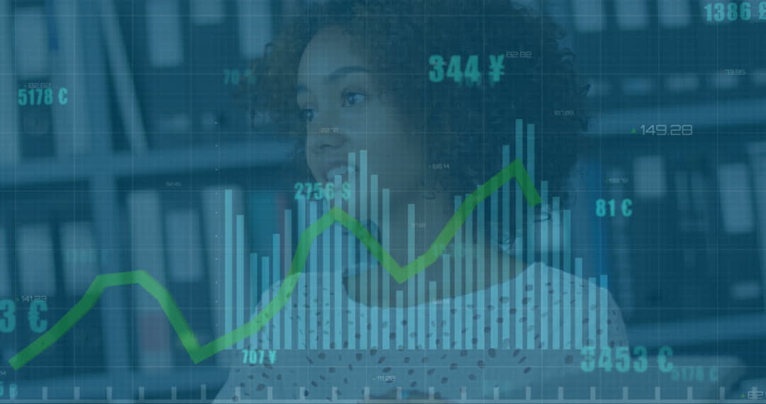 Businesswoman in an office environment with an overlay of financial data and stock market trends on a digital chart. Ideal for visuals related to financial analysis, business strategy, corporate growth, investment, or economic forecasting. Can be used in articles, brochures, or presentations discussing market trends, data analytics, and business Finance.-oriented services.