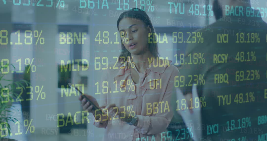 Woman engaging with financial data overlaid on her video, representing business analysis and market trends. Ideal for finance, technology, investing insights, and innovation projects.
