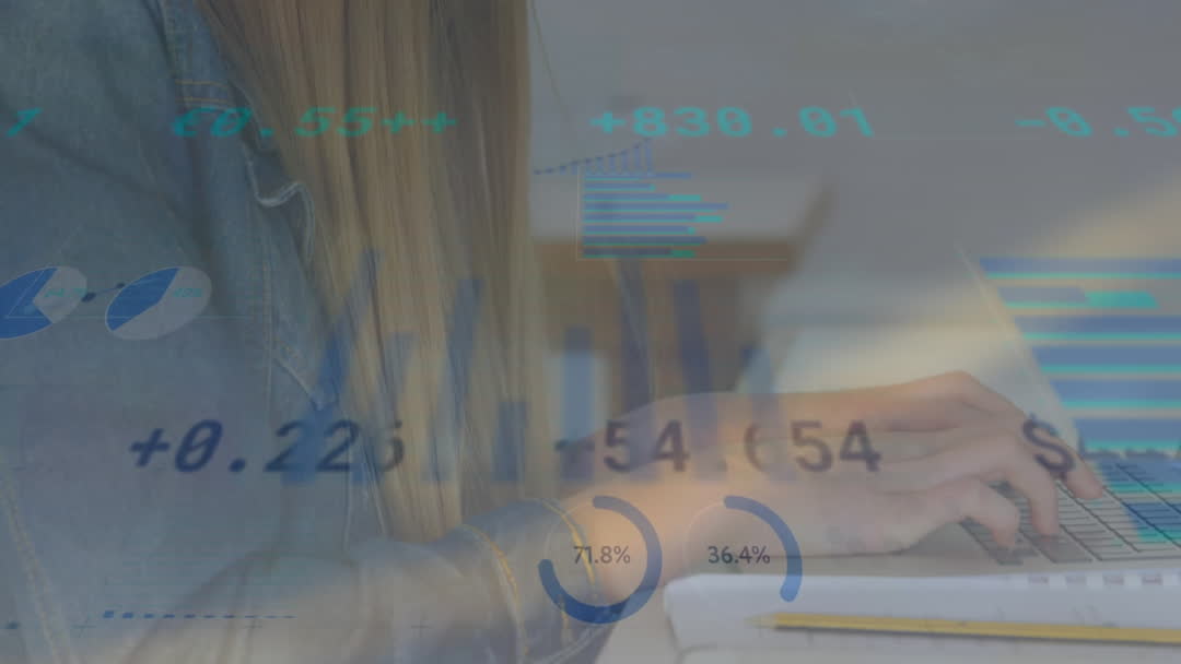 Caucasian businesswoman is using a laptop while animated stock market data and graphs overlay, merging business technology with analytics. This videory emphasizes financial industry themes like market analysis and economic growth, making it ideal for articles, presentations, and marketing materials focusing on finance, economic insights, and digital analytics.