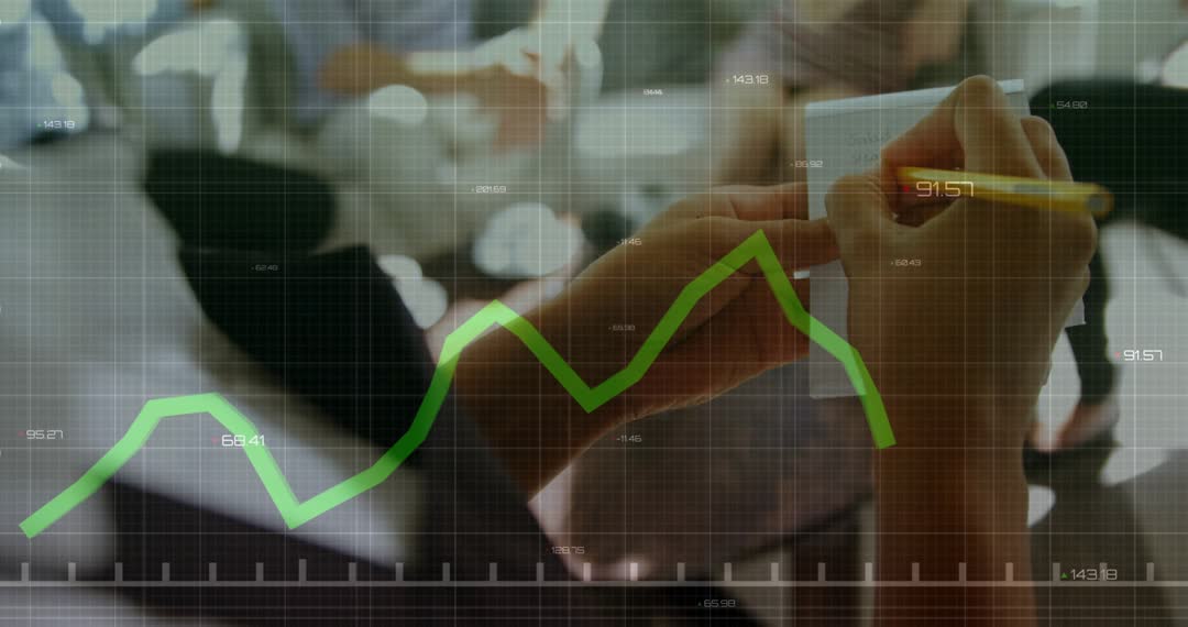 This video captures a businesswoman taking notes as a dynamic, green line chart appears, indicating data trends and growth potential. In a blurred background, other professionals suggest a collaborative business setting. This visual can be used for storytelling about analytics, corporate strategies, professional insights, and teamwork-driven success. Ideal for content focused on business growth strategies, data-driven decision-making, or corporate team dynamics.