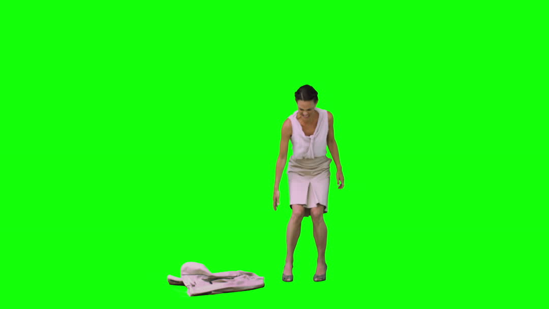 Businesswoman displaying frustration, dropping a jacket on green background. Useful for depicting emotions of stress or anger in professional settings or presenting drama in workplace content. Ideal for creating surrounding designs or overlays due to green screen capability.