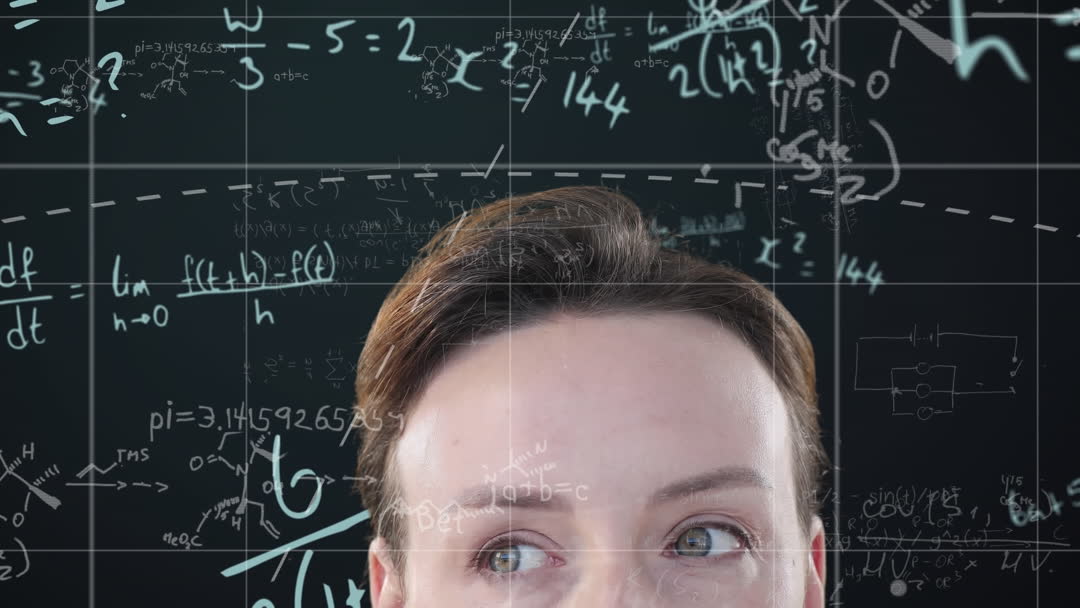 A businesswoman looking intently with computational equations charted over her vision, represents problem-solving and analytical thinking in a business context. This can be useful for business presentations about productivity and innovation as well as articles on educational content about mathematical topics.
