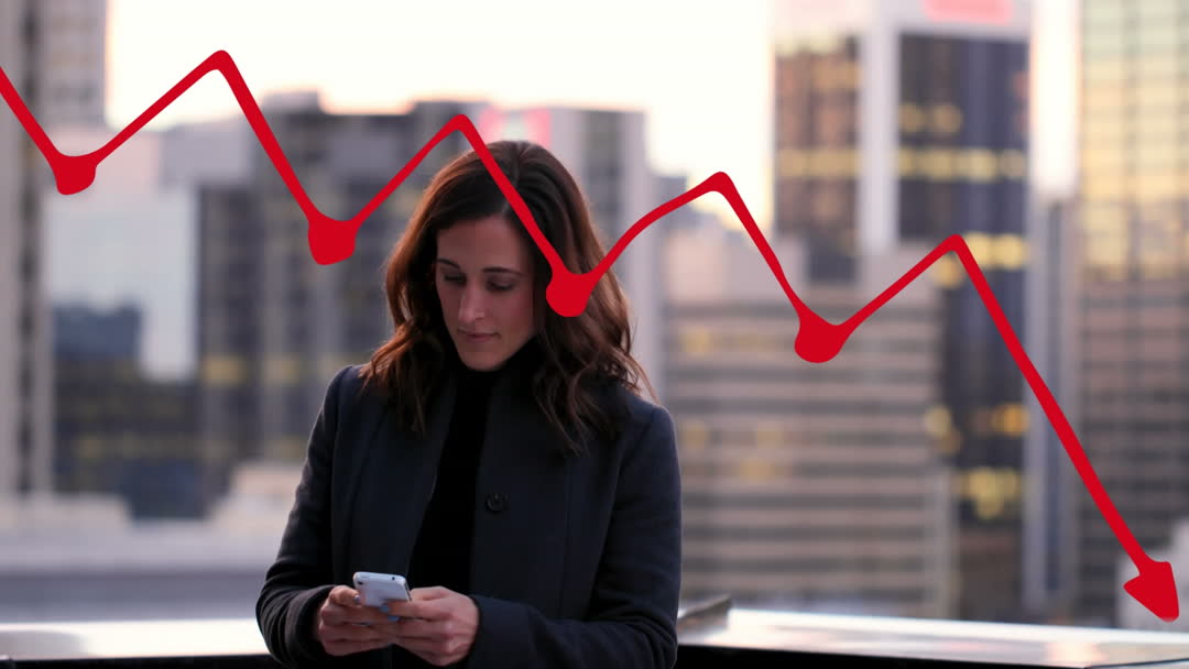 Businesswoman standing outdoors in front of a city skyline using her smartphone while a declining red graph overlays depicting a financial downturn. This video conveys concepts of economic fluctuation, market challenges, and business communication. Useful for presentations or articles on financial stability, economic trends, or market impacts.