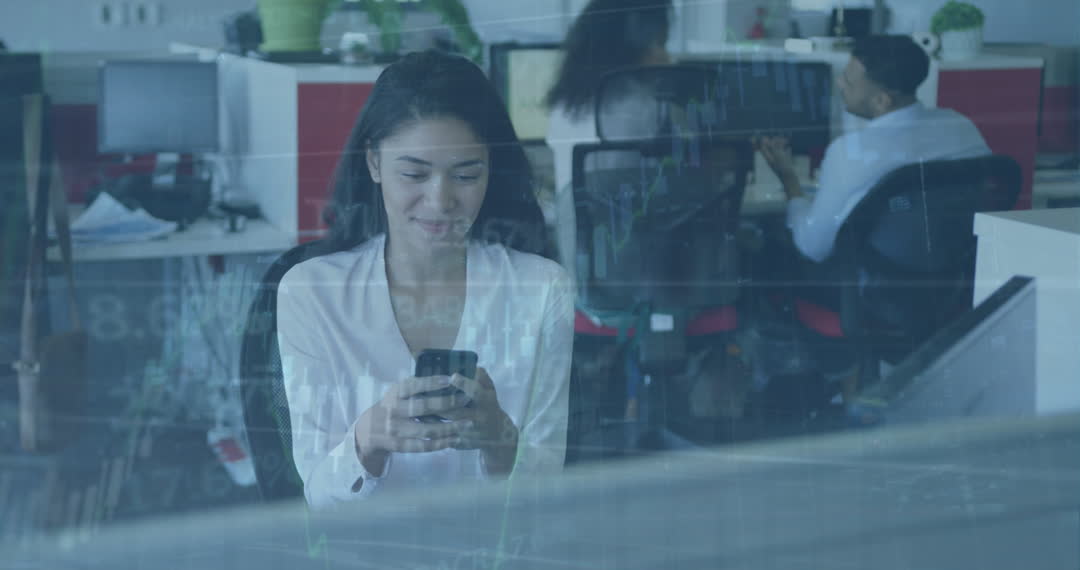 Young businesswoman sitting in a modern office checking her smartphone with digital financial data processing overlay. This video conveys the integration of finance and technology in the corporate world. Useful for illustrating themes related to business technology, finance, multitasking in digital spaces, or modern office settings.