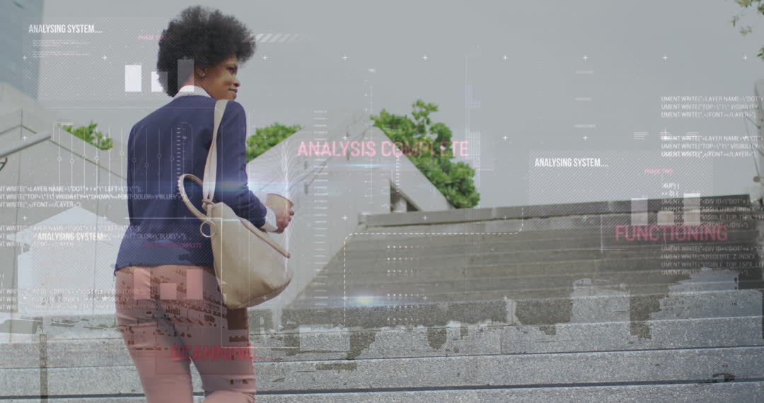 African American businesswoman ascending stairs with an overlay of digital data processing graphics. This fusion of business and technology concepts can be used for promotional content related to tech-forward companies, modern workplace environments, or innovation. Ideal for illustrating determination and futuristic business approaches.