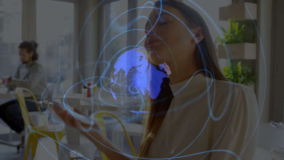 Businesswoman in a cafe talking on mobile phone while a translucent globe with emanating lines illustrates worldwide communication. Useful for depicting themes of technology, global business, and connectivity. Suitable for corporate presentations, technology tutorials, and networking events.
