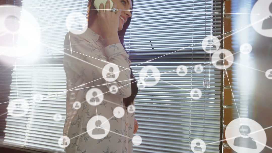 Businesswoman using smartphone visually connected to a network. Ideal for illustrating concepts of modern business communication, digital networks, and technology in professional settings.
