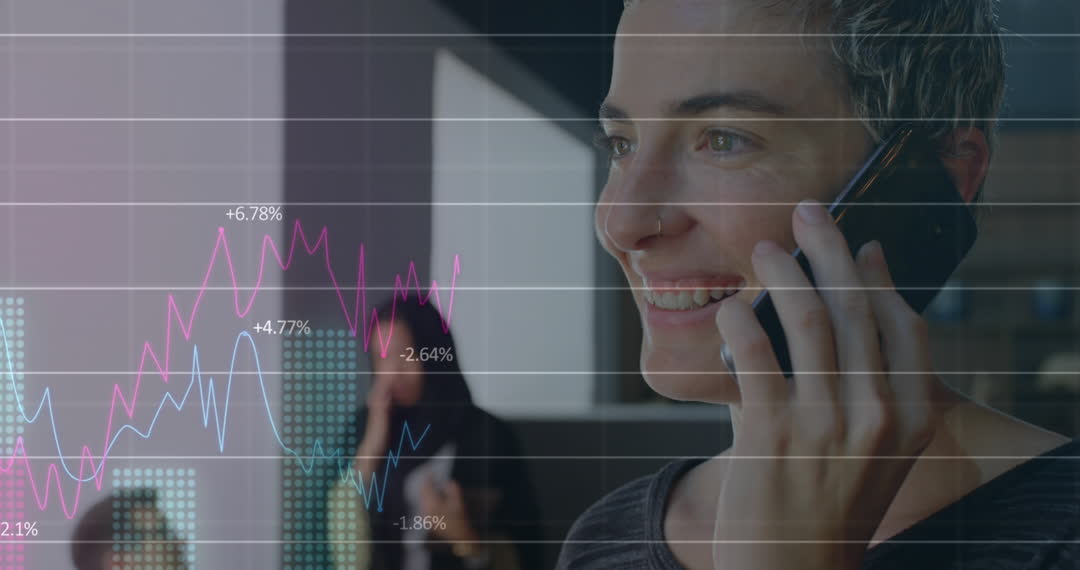 A professional woman is talking on a smartphone against a backdrop of dynamic statistical charts and graphs. This visual represents the integration of business communication with data analysis, offering insights into financial performance and technology in workplace scenarios. Suitable for illustrating articles, presentations, or reports focused on business strategy, technology integration, or financial forecasting.