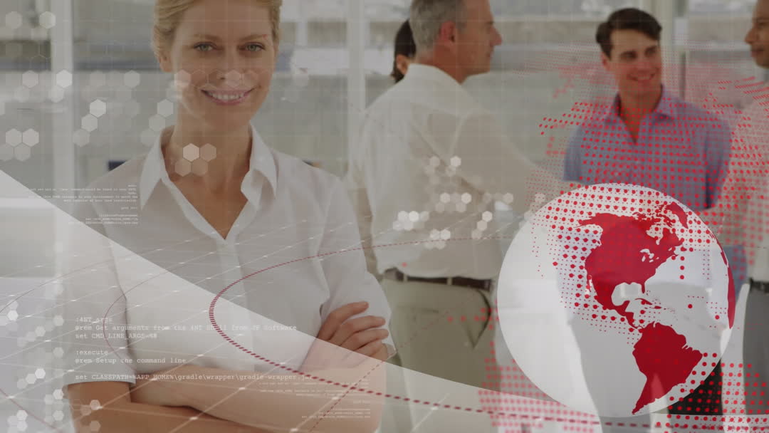 Confident businesswoman standing in a sleek modern office space, overlaid with digital data patterns and a globe illustration. This visually compelling video suggests concepts of global communication, digital transformation, and professional success. This can be used for marketing materials, presentations, or websites that emphasize business innovation, technology transformation, and global connectivity.