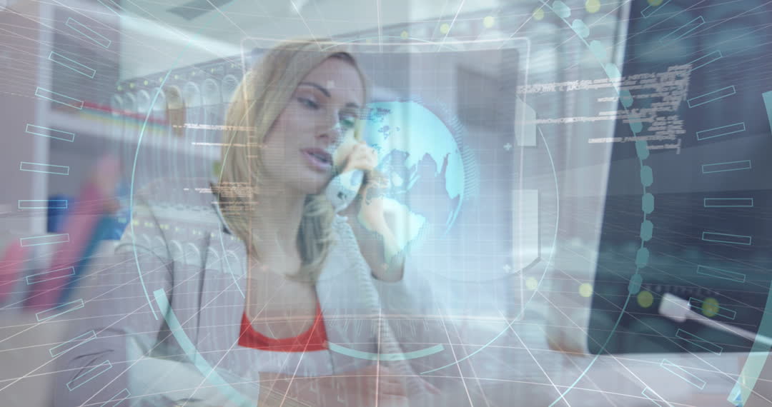 This video features a businesswoman in a modern office environment discussing ideas over a smartphone. Overlapping visual elements such as digital globes and futuristic interfaces highlight 5G technology and data analytics themes. This composition is useful for illustrating concepts of global business communication, advanced technology, collaboration, or business strategy presentations.