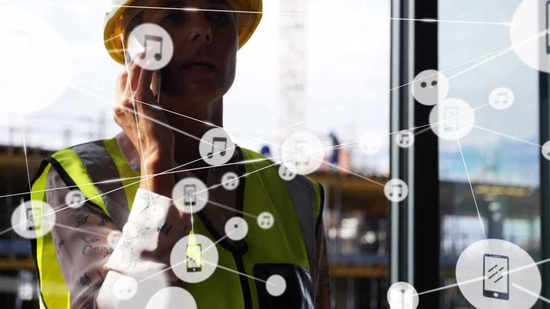 Businesswoman in a construction setting talking on her smartphone, netted by animated connection icons, represents digital integration in modern infrastructure projects. Ideal for concepts related to technology advancement, telecommunications integration, or innovative construction practices.