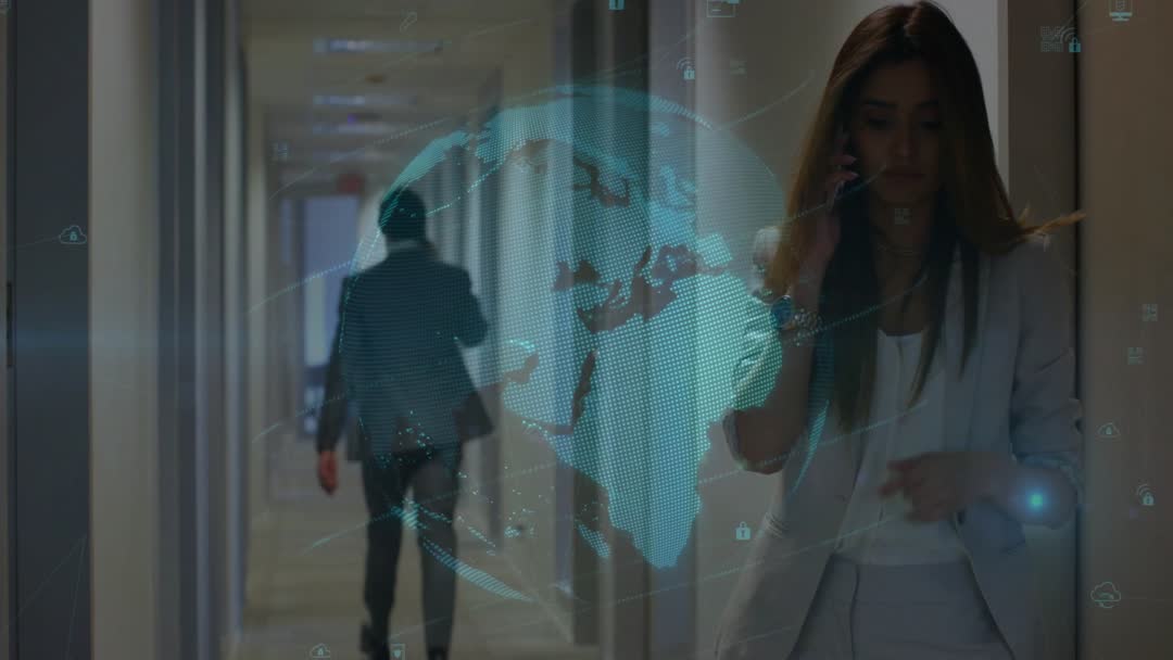 Suited professional conversing on mobile emphasizes technological advancement within office environment. Animated digital world map highlights global reach of company's initiatives. Useful for representing concepts related to global business strategies, technology interaction, or corporate networking possibilities.