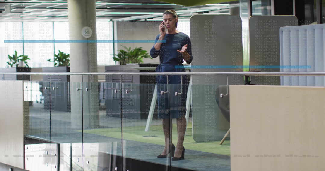 Confident businesswoman standing with smartphone, engaging in conversation in stylish, modern office. Transparent data overlay emphasizes futuristic, technology-driven workspace. Ideal for highlighting themes of communication, technology integration, and professional settings in corporate materials and business strategy visuals.