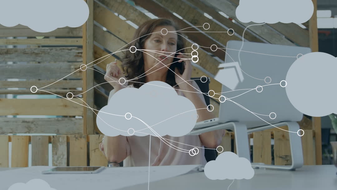 A businesswoman communicating on her phone with animated cloud and network icons overlay, symbolizing connectivity and modern digital tools. Perfect for use in content related to business innovation, cloud technology services, digital marketing campaigns, and illustrating modern office environments in promotional materials.