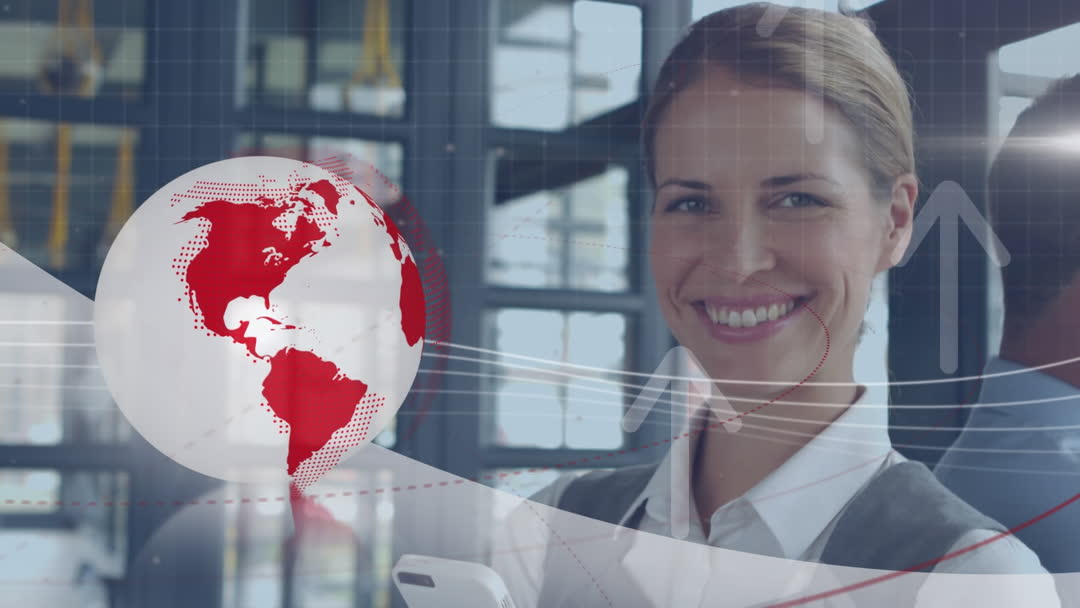 Depiction of a successful businesswoman smiling while engaging with innovative global networking technology in an office environment. This composition of globe animations and upward arrows represents connectivity and leadership, suggesting themes of international communication and advanced business solutions. Ideal for use in business presentations, corporate branding, or articles about technological advancements in professional settings.