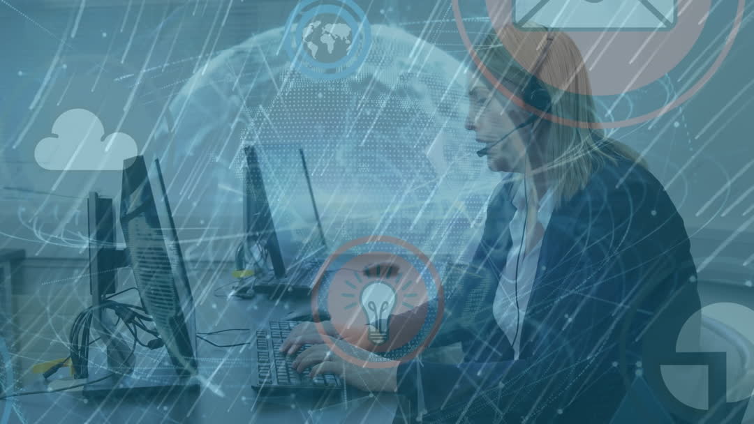 A businesswoman is working on the computer, surrounded by digital icons representing cloud computing and global connections. Her focus highlights her role in a technologically advanced office environment. This video can be used for illustrating cloud services, global business communication, modern finance tools, or professional networking across digital platforms.
