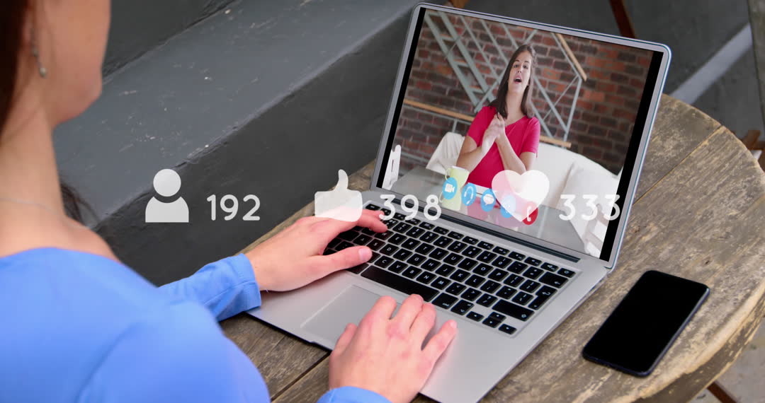 A businesswoman sits at a table, interacting with a laptop displaying a video call or webinar. Social media icons indicate real-time engagement such as likes and followers. Suitable for use in presentations or articles on remote working, online communication trends, or digital business.