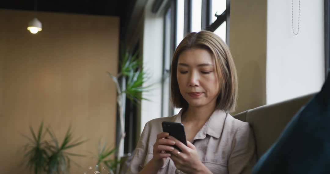 An Asian businesswoman sitting in a modern office space is using her cellphone with animated dots around a globe metaphorically showing digital global communication. Ideal for use in contexts involving modern business environments, tech studies, advertisements for telecommunication services, or articles on globalization and digital skills.