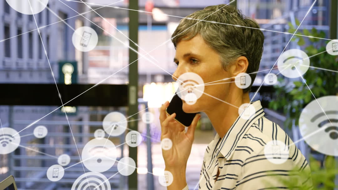 Businesswoman using smartphone with network connection overlay signifies digital connectivity and communication in modern business. Ideal for articles on global business operations, technology in communication, and wireless solutions.