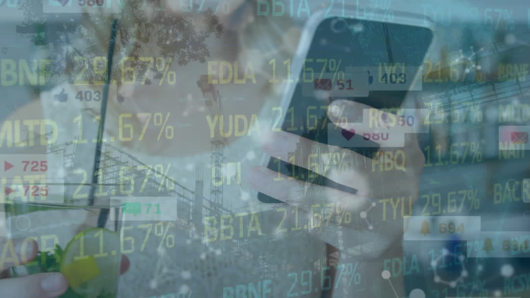 Image depicts a woman in a restaurant using a mobile phone with digital financial data overlaid, symbolizing multitasking and modern business engagement. Suitable for articles about technology in business, remote work, and the integration of digital insights in everyday life.