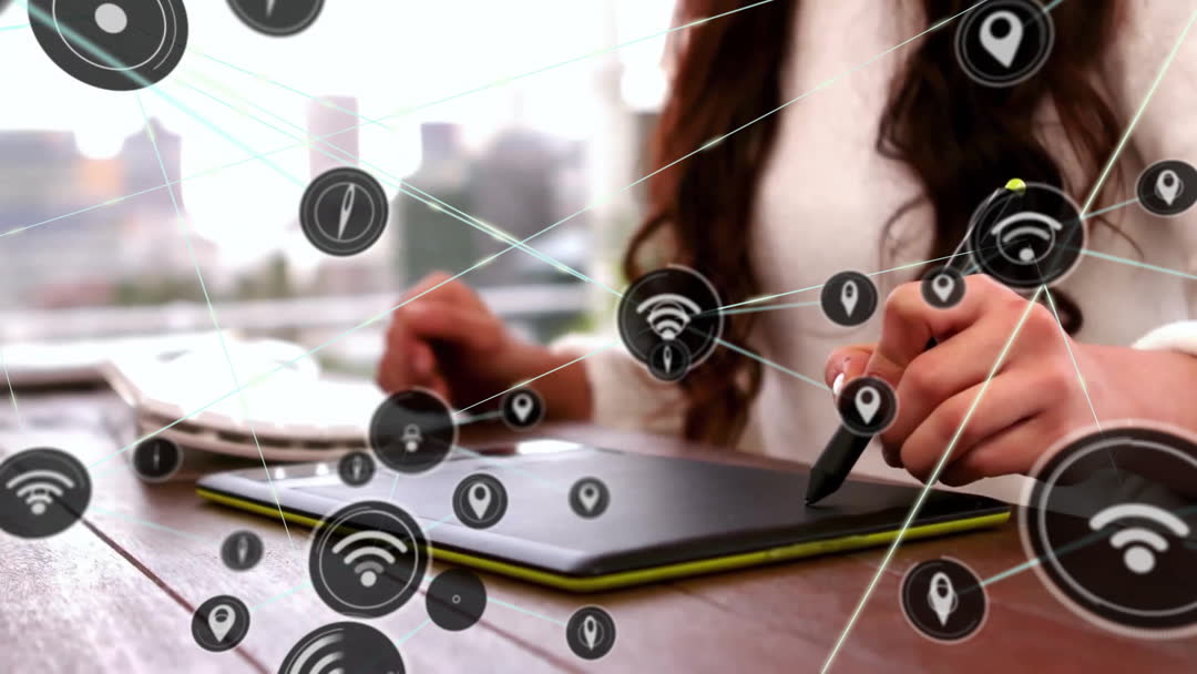 Businesswoman interacts with a tablet, surrounded by digital network connectivity icons, suggesting advanced technological integration and communication. Ideal for themes on modern business practices, digital environments, wireless technology, and communication strategies in professional settings.