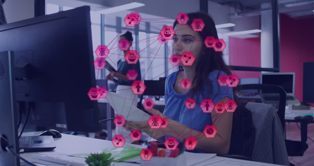 A businesswoman interacts with digital icons overlay while examining documents and using a laptop in a modern office environment. This setting highlights the intersection of traditional business practices with advanced technology and innovation, suitable for depicting themes of digital transformation, modern teamwork strategies, or remote working. Applicable for business technology presentations, online articles on digital innovation, or corporate imaging campaigns.