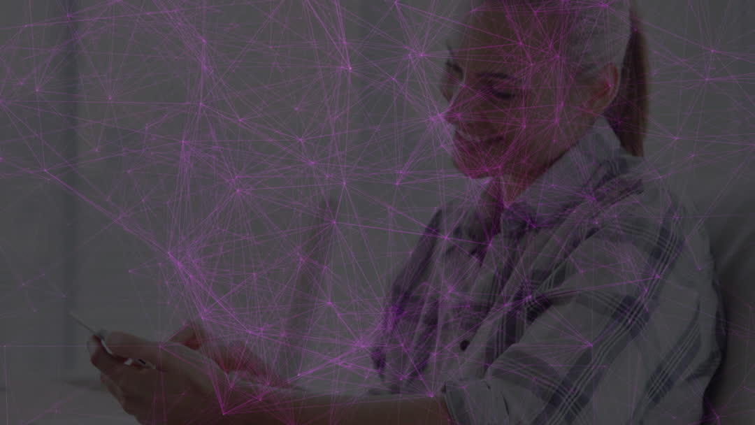 Image shows a businesswoman interacting with a digital network overlay in an office. The intricate web of connections signifies advanced technology use and digital communication. Ideal for marketing materials or presentations on industry 4.0, digital transformation, tech innovations, and connecting businesses globally.
