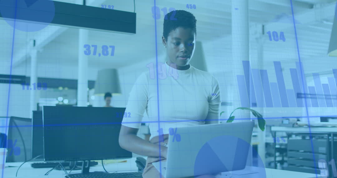 Casual workspace setting with businesswoman interacting with digital data displays. Visible financial charts and graphs overlay, illustrating data analysis and technology use in business. Suitable for visuals illustrating modern business concepts, data analytics, and technology-driven environments.