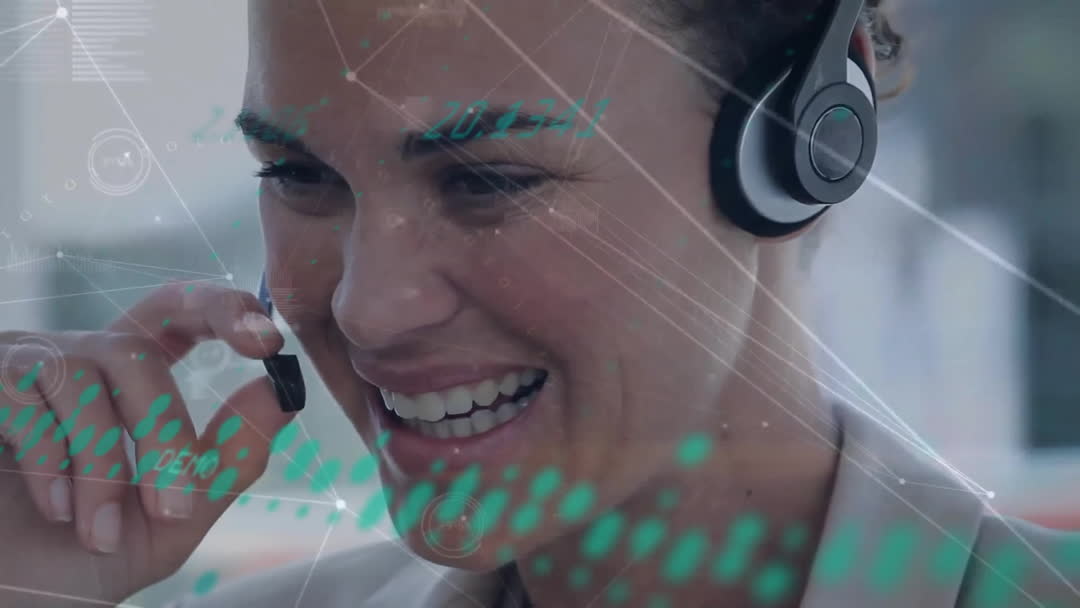 This video features a businesswoman using a headset while engaging in communication, highlighted by digital overlays illustrating data and networking concepts. Ideal for illustrating themes of modern business communication, digital transformation in the workplace, or customer service in technologically driven enterprises.