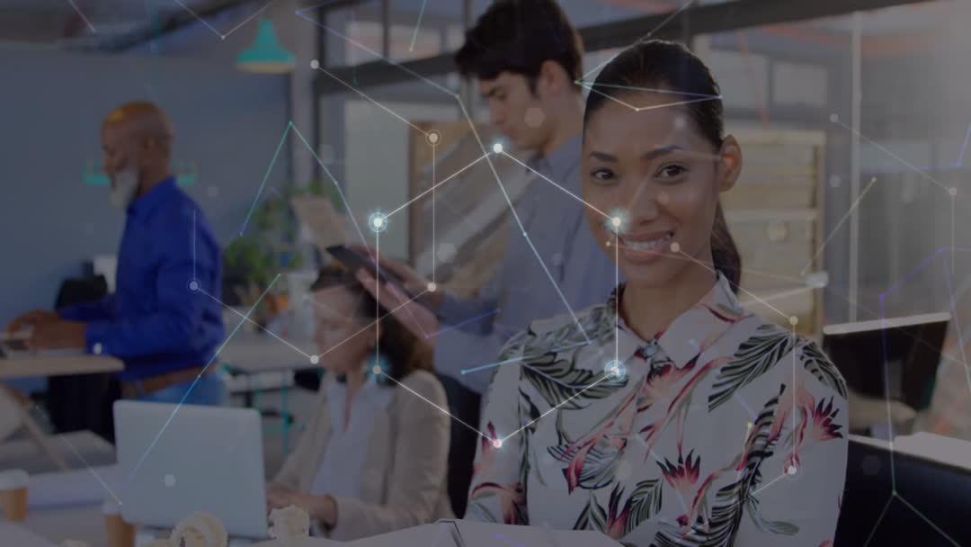 A confident biracial businesswoman smiles in a vibrant, technology-enabled office with colleagues at workstations. Interposing the visual are stylized digital network graphics, symbolizing innovative communication and connectivity in today's business environment. Ideal for illustrating themes of modern entrepreneurship, technology integration, and dynamic team collaboration.