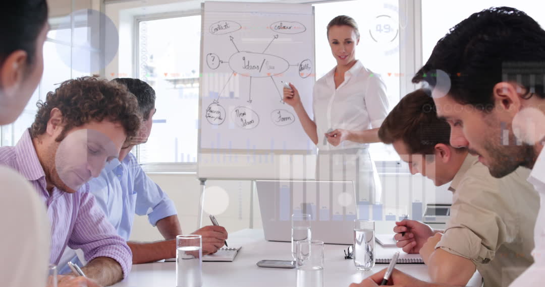 Businesswoman is leading a presentation at an office, engaging colleagues around a table, using a flipchart with diagrams. Computer interface elements overlay scene, symbolizing data analytics and modern technology in business practices. Ideal for use in promoting leadership, teamwork, business strategies, corporate training programs, or showcasing innovative office environments.