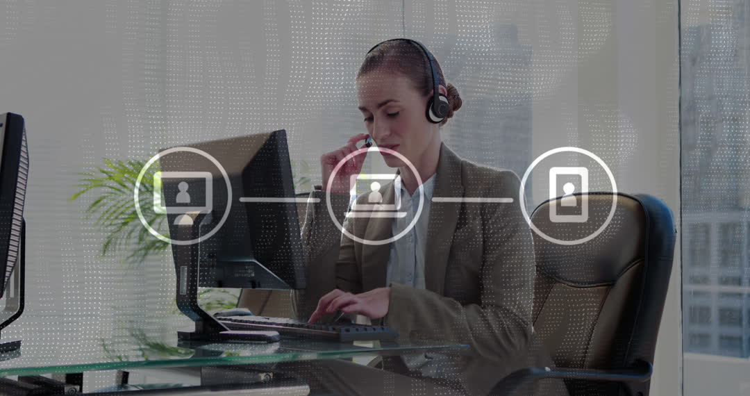 Businesswoman using a headset while working at a computer in a modern office environment. Visible digital interface graphics suggesting connected data processing. Perfect for illustrating corporate technology, data analytics services, and modern workplace solutions, as well as innovative office setups.
