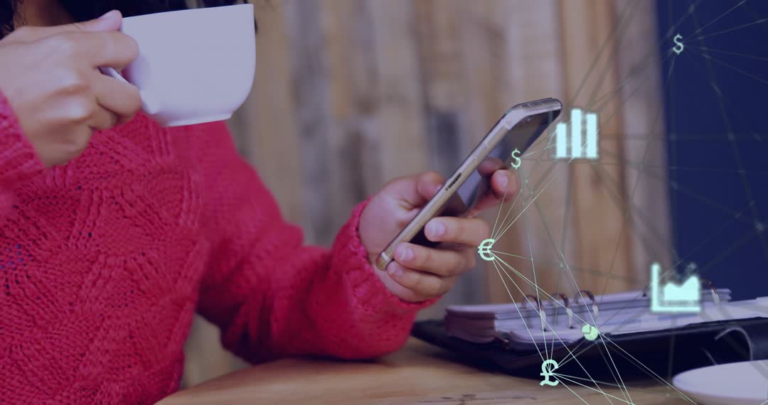 A businesswoman in a cozy red sweater sips coffee while tapping a smartphone. In front of her, animated finance icons suggest a focus on money management or financial planning. This videory is perfect for illustrating concepts in financial technology, investing, business strategies, and productivity. It can be used in articles, presentations, or advertising for fintech solutions or productivity apps.