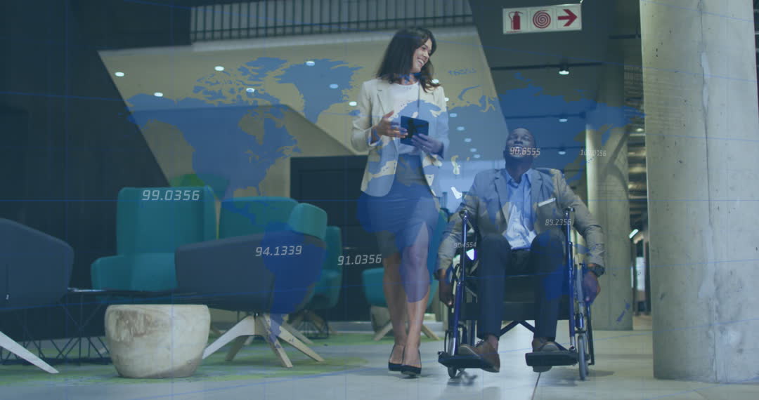 Smiling businesswoman aids a coworker using wheelchair, walking together through chic office lobby. Transparency of data and map overlay evoke cutting-edge business environment, denoting global connections and tech-savvy strategies. Useful for illustrating diversity, accessible workspaces or suggesting modern, integrated approaches to business. Visual speaks to leadership, collaboration, international futures and how businesses collect and process data easily.