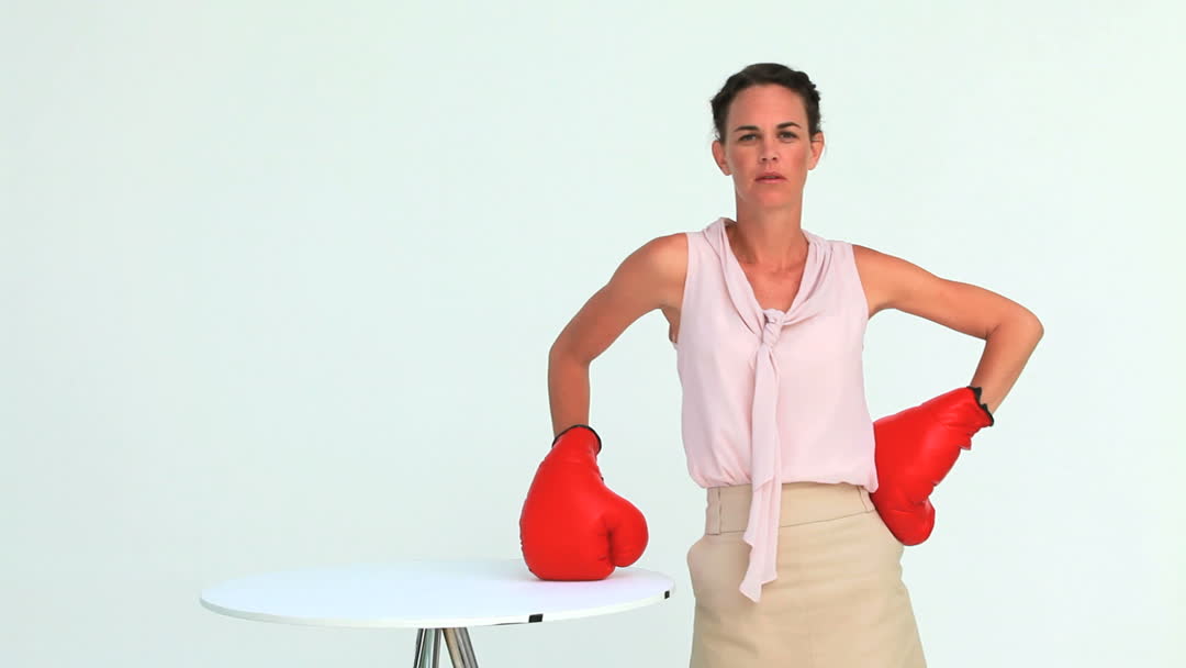 - Businesswoman in Boxing Gloves Eyeing Challenge in Studio Setting