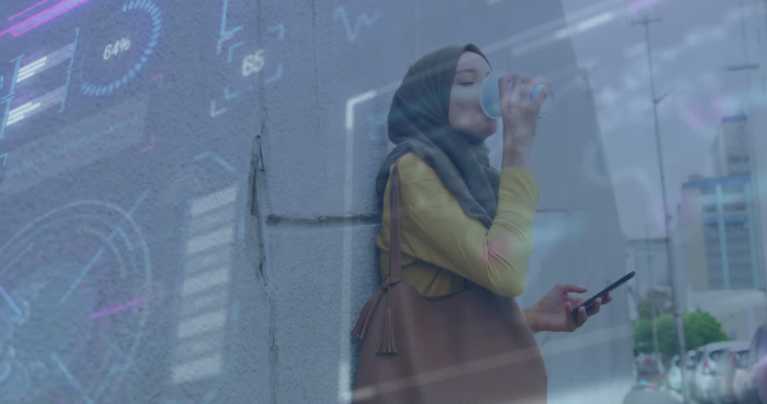 Businesswoman leaning against wall with mobile phone, sipping from cup, surrounded by technological data graphics. Reflects modern working methods integrating technology. Useful for articles on diversity in business, advanced data analytics, women in STEM industries, digital transformation in urban settings, or global economic trends.