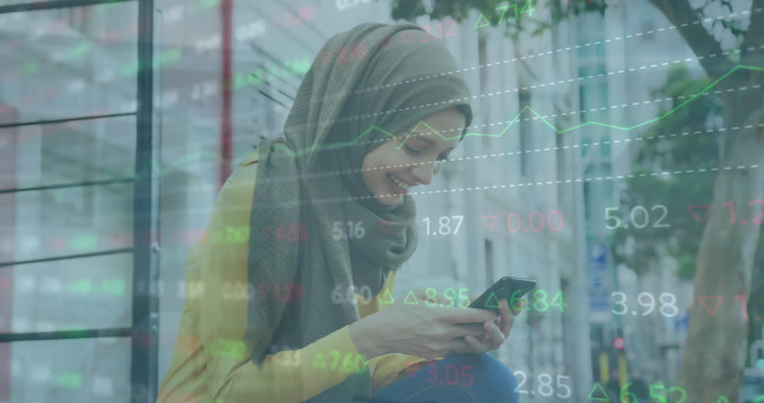 A businesswoman wearing a hijab studies stock market data on her smartphone, set against a busy urban backdrop with projected graphs and charts. Perfect for illustrating topics related to global economy, finance, or the use of modern gadgets in trading and analysis. This video can be used in articles discussing economic trends, technology in business, or multiculturalism in the financial sector.