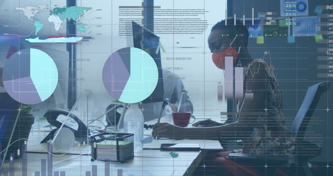 Businesswoman wearing face mask conducts financial data analysis with holographic graphs overlay amidst pandemic situation, highlighting modern workplace trust in technology and remote sectors post COVID-19. Ideal for articles on business trends, finance technology advancements, professional environments amidst health precautions, or the impact of data analytics in post-pandemic business strategies.