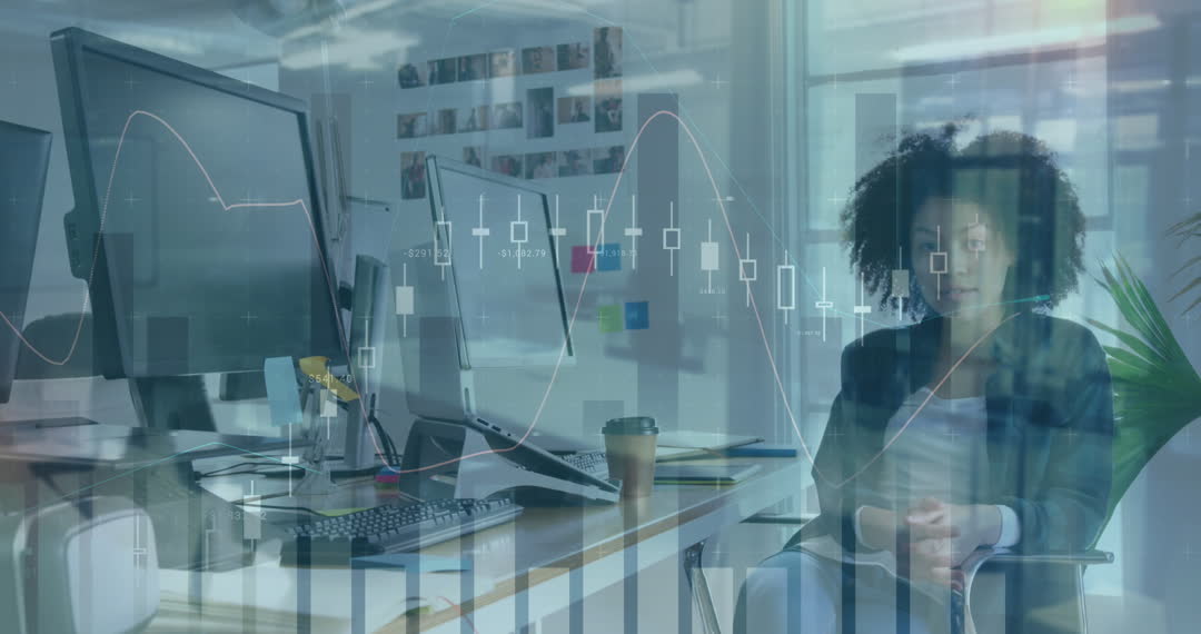 Businesswoman appears inside office with computers and financial data charts overlaying scene. Ideal for representing themes of financial analysis, digital technology in business, modern business environments, or global markets. Useful for presentations and marketing materials stressing analysis, innovation, or data-driven decision making.