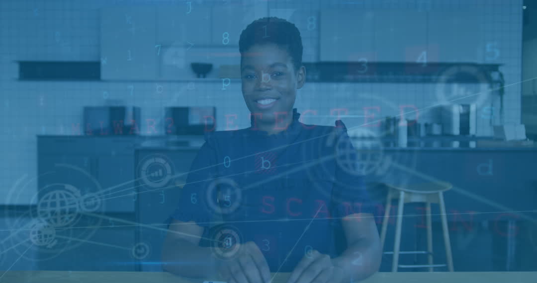 African American businesswoman sits in an office environment, overlayed with financial data processing graphics. Highlights modern communication methods in the business world, enhancing presentations on technology in international business or virtual communication strategies.