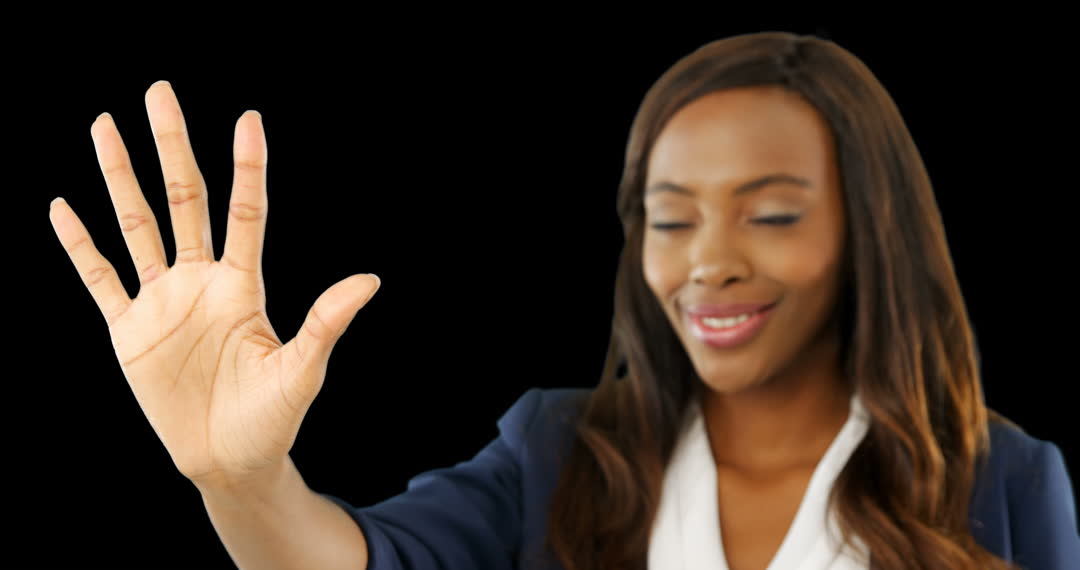 African-American businesswoman engaging with a virtual interface, implying futuristic use of technology in a professional setting. Her gesture suggests an interaction with a screen effect. This visual is suitable for use in presentations on technology, corporate design, innovation shows, and articles highlighting digital advances.