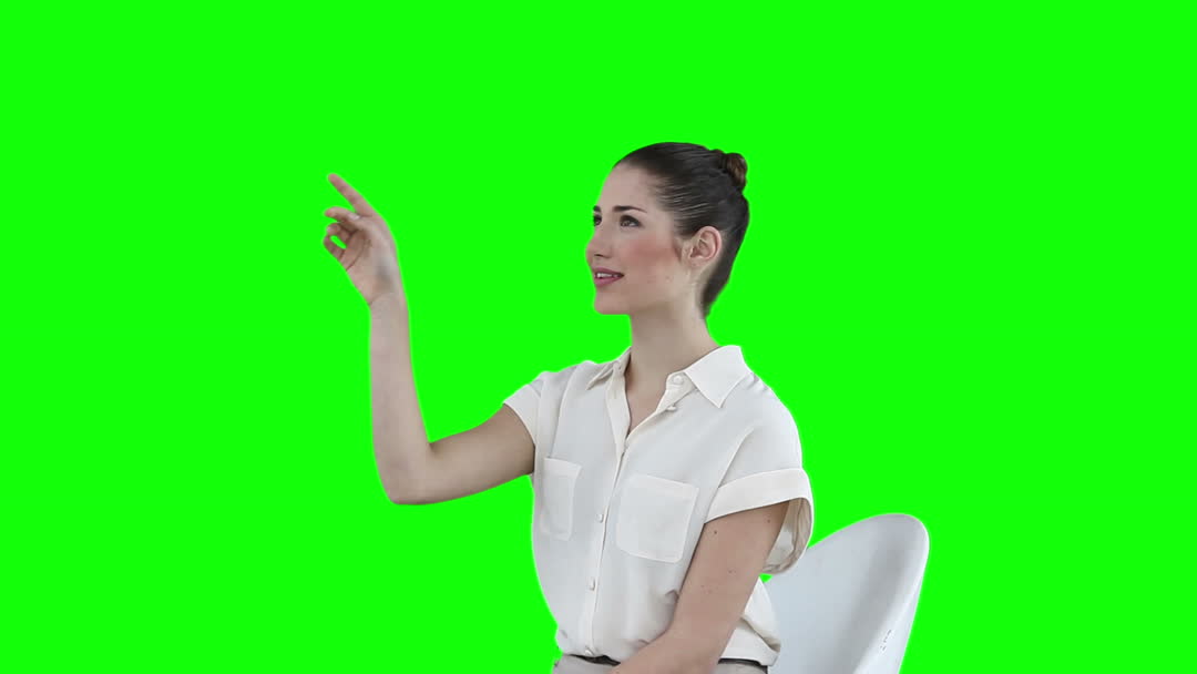 Businesswoman seated and interacting with an invisible virtual touchscreen on a bright green background. Useful for presentations or marketing materials emphasizing technology, professionalism, and workplace interaction. This video can be ideal for illustrating articles on virtual interfaces and innovation in the workplace.