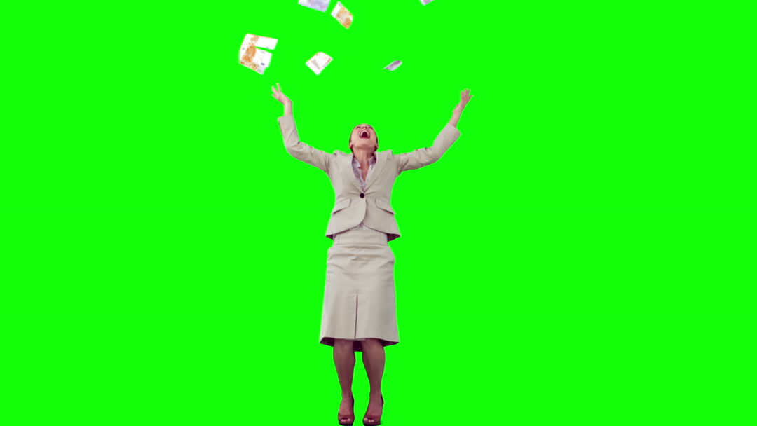 - Businesswoman Joyfully Tossing Money on Green Screen
