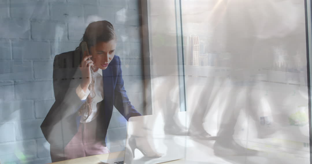 This depiction of a businesswoman multitasking highlights modern workplace dynamics, blending personal device usage with technical workspace management. Ideal for illustrating themes of contemporary business, technological integration in professional settings, and entrepreneurship. The double exposure effect enhances its application in creative and editorial projects about urban business activity and corporate innovation.