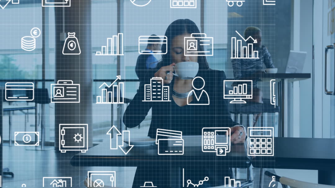 Businesswoman sitting in a modern office environment, using a digital tablet while drinking coffee. Overlay of financial and technological icons represents multitasking and the fusion of traditional office tasks with digital technology. Ideal for use in business articles, professional training materials, or promotional content related to technology in the workplace.