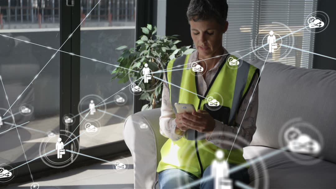 A businesswoman sits indoors wearing a high-visibility vest, engaging with her smartphone amidst a conceptual overlay of network connections. This depiction illustrates the modern world of connectivity and communication. Ideal for use in articles about technology's impact on business, corporate strategy, or digital transformation.