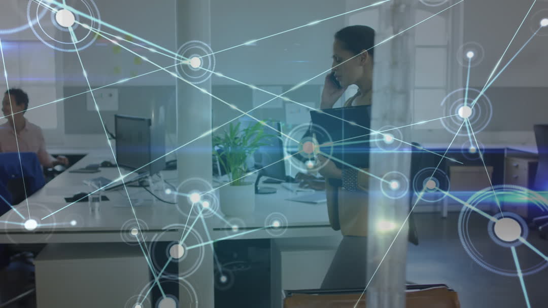 Businesswoman Networking in Office with Digital Connections Overlay Video