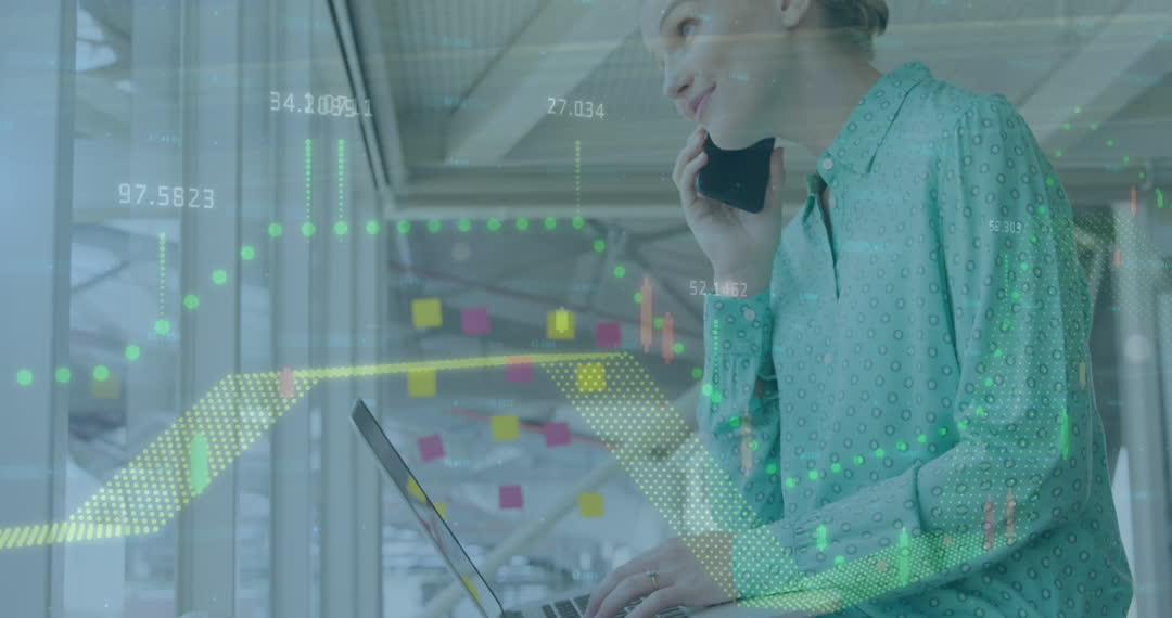 Businesswoman holding cellphone while working on laptop, multitasking in modern office. Graphs and data layered, representing stock market fluctuations and financial analysis. Ideal for content on business technology, financial sectors, communication skills, and multitasking in the workplace.