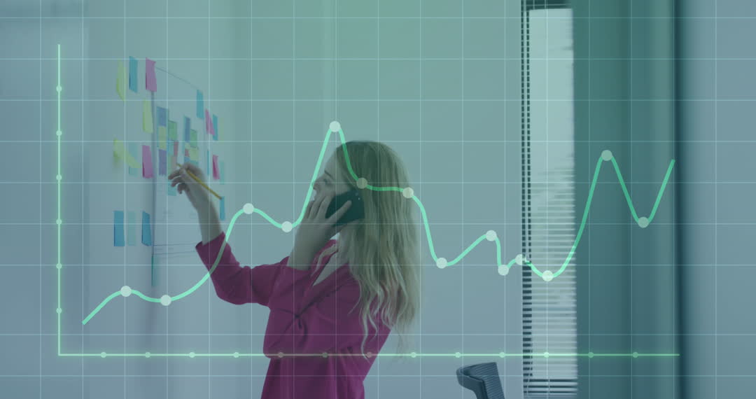 Businesswoman in smart casual wear standing in front of sticky notes, talking on phone, overlaid with financial graph visual. Concept evokes collaboration, productivity, and strategic decision-making in a corporate setting. Ideal for illustrating business strategies, data analysis, or teamwork in a professional environment.