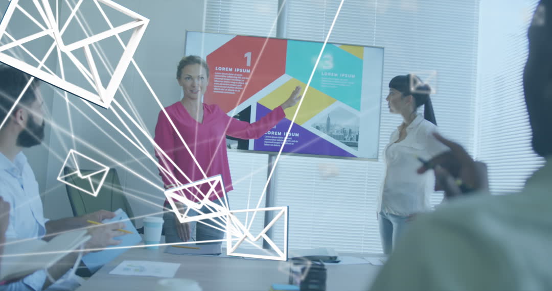 Professional atmosphere with a businesswoman giving a strategic presentation in a modern office with colleagues listening attentively. Overlaid email icons symbolize communication and global connectivity. Useful for illustrating concepts related to corporate teamwork, digital communication, and interactive business strategies.